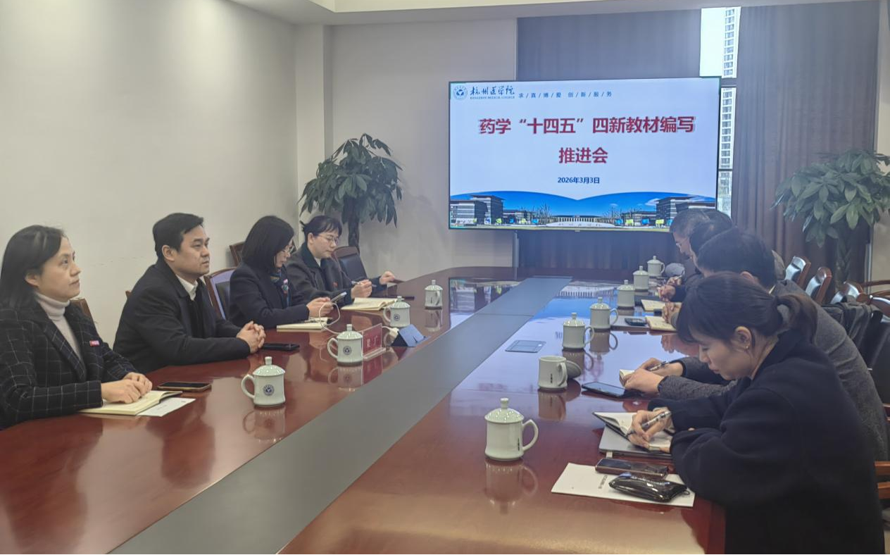 为扎实推进省普通本科高校“十四五”新四科教材编写工作,确保编写任务按期高质量完成,药学院、食品科学与工程学院于2026年3月3日在临安校区图书馆632会议室召开教材编写推进会。《新药研发全链条关键技术》系列教材总主编梁广校长,教务处王黎芳处长、杜文婷副处长,浙江大学出版社阮海潮编辑,各分教材主编及部分教师参加会议,会议由药食学院施菁院长主持。